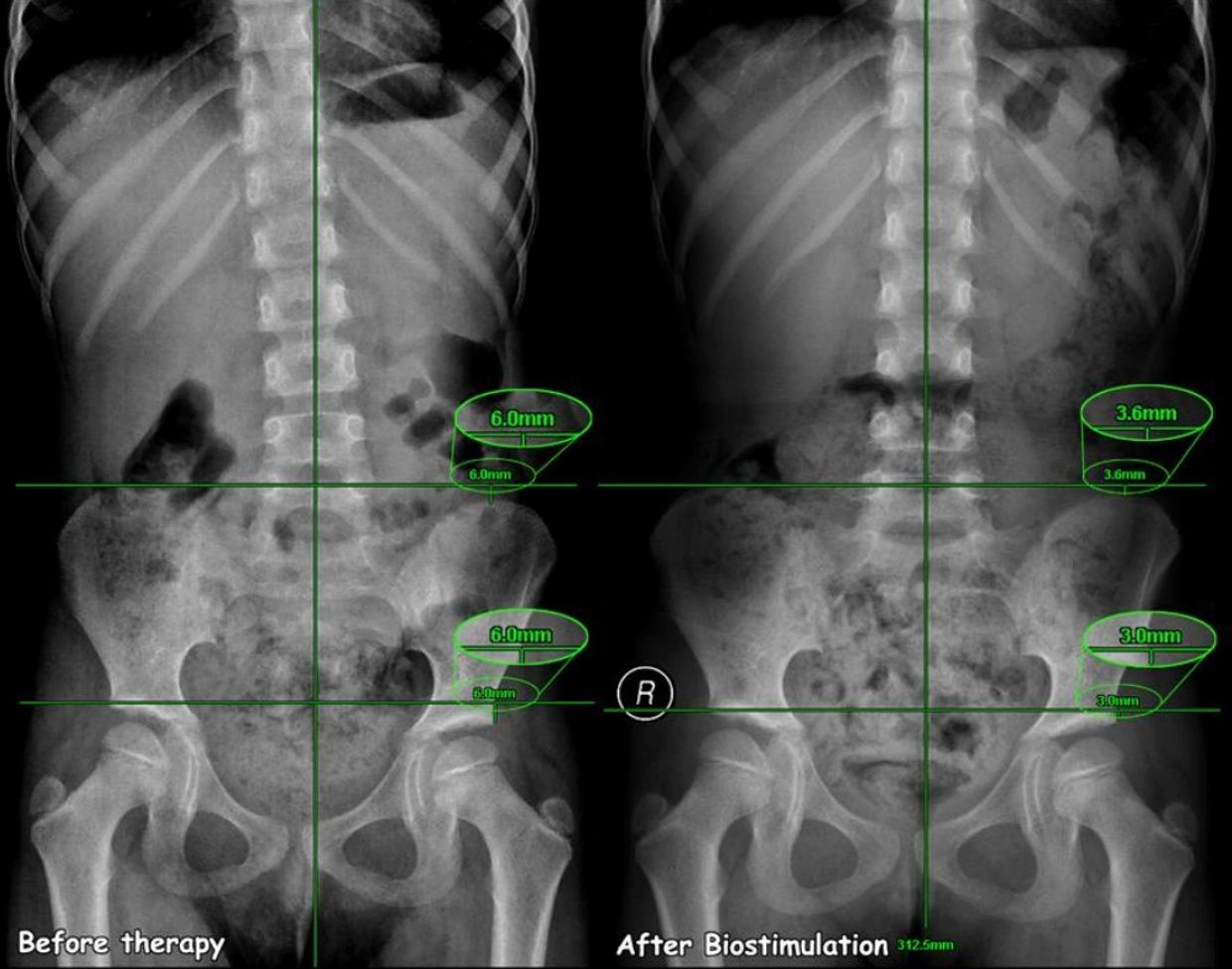 Paciente chegou para o atendimento com dor severa nos ombros e coluna, o RX mostrava o ombro direito para baixo e o quadril esquerdo também, usando o Biomodulador no pescoço da paciente afim de corrigir a Síndrome da Bola de Boliche. A paciente foi novamente submetida ao RX e verificou-se uma melhoria no alinhamento em 59%.